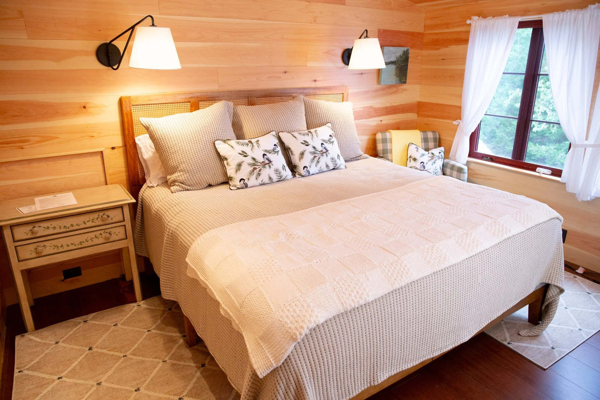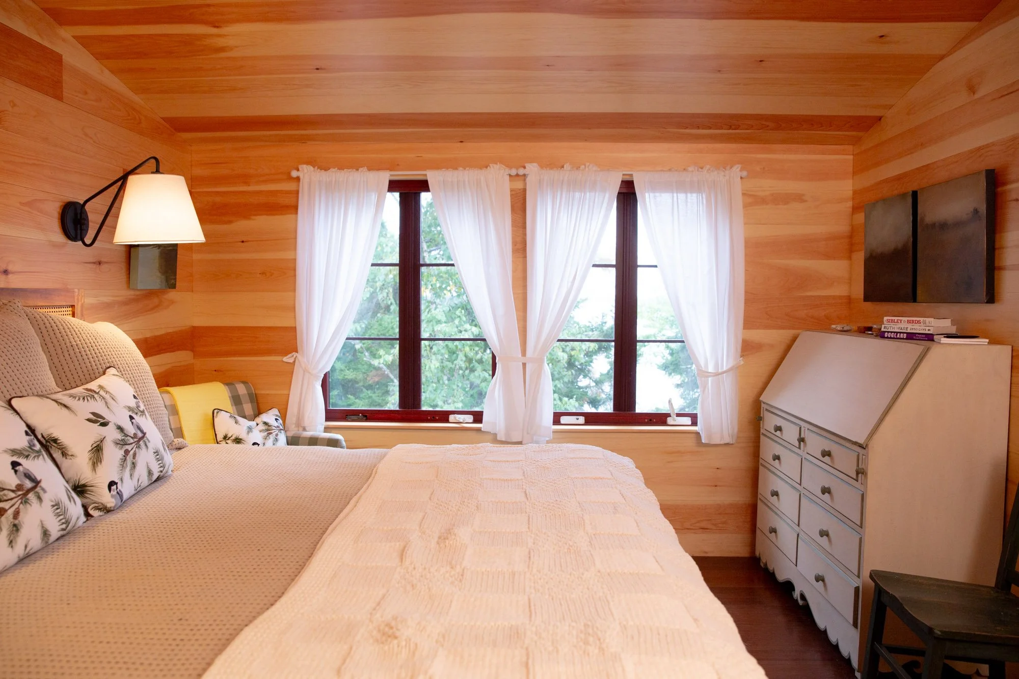 The design strategy carefully layers decorative fixtures to enhance the camp’s rustic character, while discreet architectural lighting highlights structural details and improves visual comfort throughout. In the expansive open living and dining area, a custom linear lighting detail animates the wood-paneled ceiling, drawing the eye upward and guiding movement from the entry toward the panoramic water views beyond.